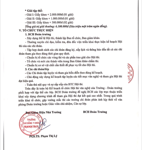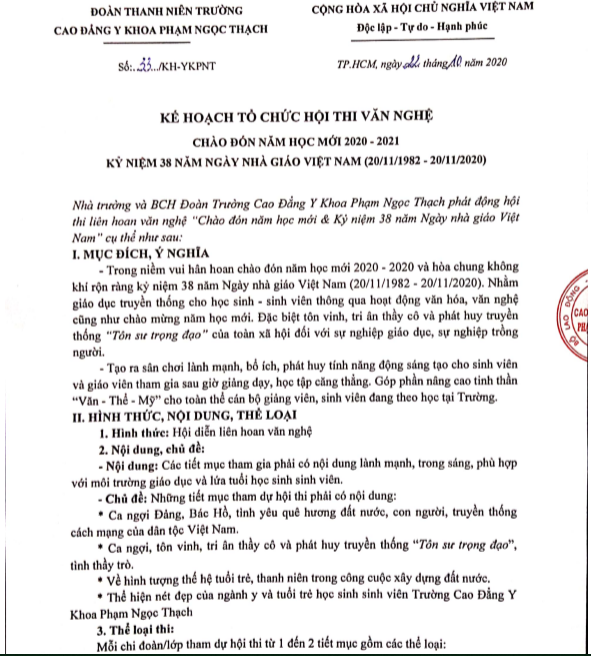 Trên đây là toàn bộ kế hoạch tổ chức Hội thi văn nghệ của trường – Đoàn trường Cao đẳng Y Khoa Phạm Ngọc Thạch phối hợp với tập thể của các lớp. Nhằm giúp các em vừa có sân chơi bổ ích và tham gia sân chơi Nhà trường tổ chức! Chúc các thầy cô nhiều sức khỏe, công tác tốt! Chúc các em sinh viên nhiều sức khỏe và có một năm học mới thành công!
