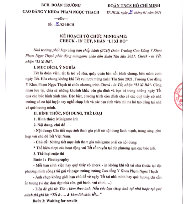 Nhà trường phối hợp cùng ban chấp hành (BCH) Đoàn Trường Cao Đẳng Y Khoa Phạm Ngọc Thạch phát động minigame chào đón Xuân Tân Sửu 2021: Check – in Tết, nhận “Lì Xì Đỏ”.