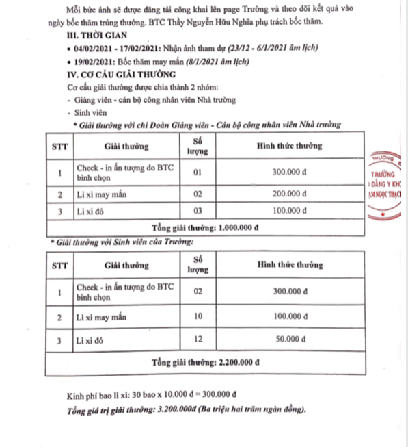 Mỗi bức ảnh sẽ được đăng tải công khai lên page Trường và theo dõi kết quả vào ngày bốc thăm trúng thưởng. BTC Thầy Nguyễn Hữu Nghĩa phụ trách bốc thăm.