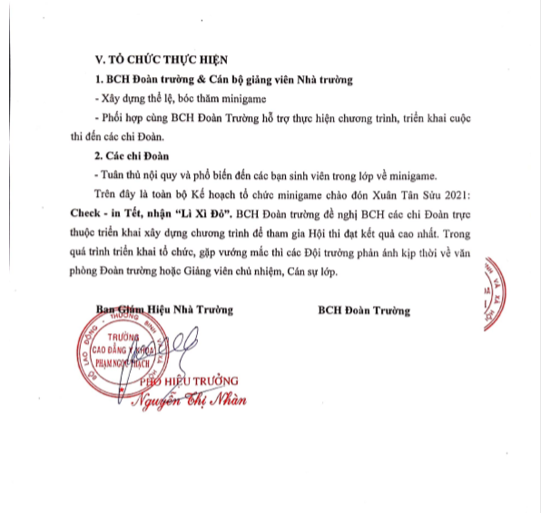 Trên đây là toàn bộ Kế hoạch tổ chức minigame chào đón Xuân Tân Sửu 2021: Check – in Tết, nhận “Lì Xì Đỏ”. BCH Đoàn trường đề nghị BCH các chi Đoàn trực thuộc triển khai xây dựng chương trình để tham gia Hội thi đạt kết quả cao nhất. Trong quá trình triển khai tổ chức, gặp vướng mắc thì các Đội trưởng phản ánh kịp thời về văn phòng Đoàn trường hoặc Giảng viên chủ nhiệm, Cán sự lớp.