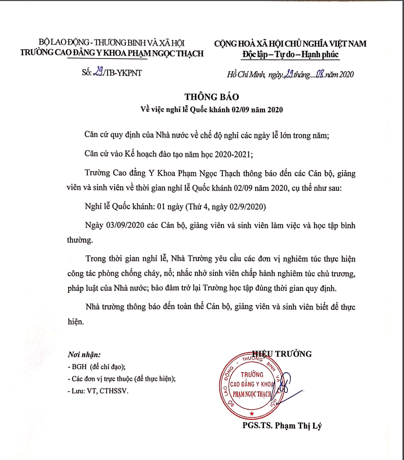 Căn cứ quy định của Nhà nước về chế độ nghỉ các ngày lễ lớn trong năm và kế hoạch đào tạo năm học 2020-2021, trường Cao đẳng Y Khoa Phạm Ngọc Thạch thông báo đến các Cán bộ, giảng viên và sinh viên về thời gian nghỉ lễ Quốc khánh mùng 2/9.