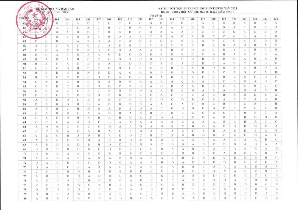 Đây cũng là một trong 3 môn thi tự chọn của mã tổ hợp Khoa học Xã Hội. Đáp án chính thức đề thi môn Địa Lý Kỳ thi tốt nghiệp THPT 2023 được cập nhật đầy đủ tất cả các mã đề 301, 302, 303, 304, 305, 306, 307, 308, 309, 310, 311, 312, 313, 314, 316, 317, 318, 319, 320, 321, 322, 323, 324.
