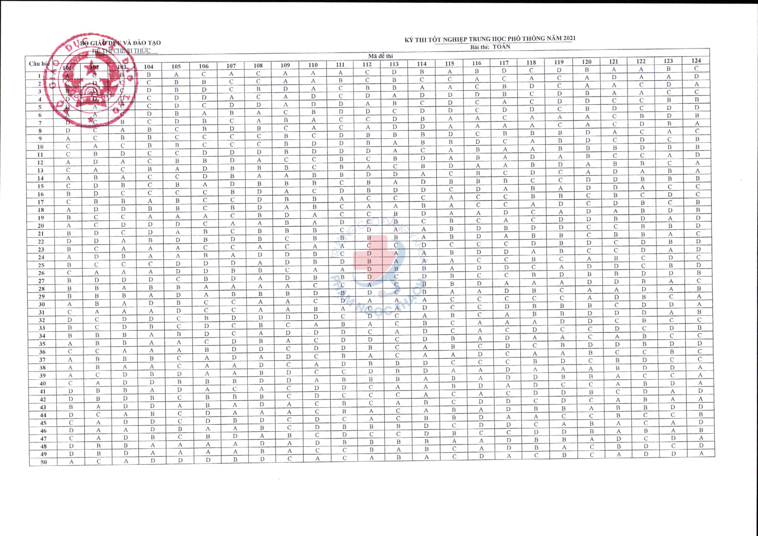 Tải đáp án môn Toán rõ nét hơn tại đây.