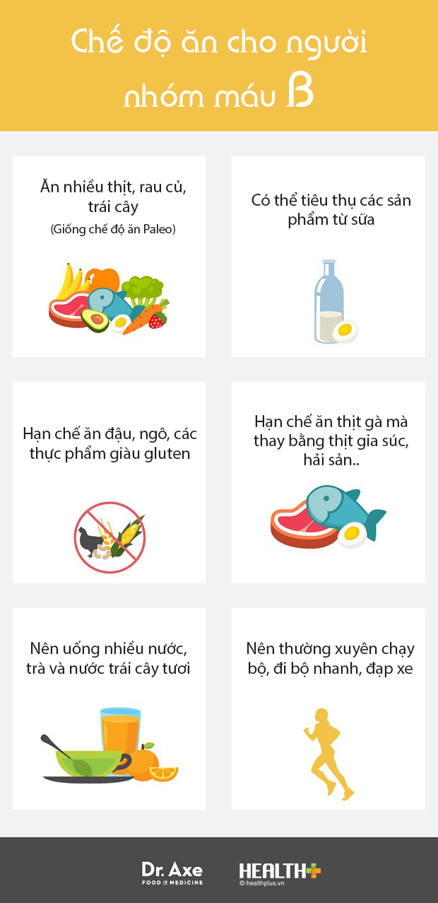 Nhóm B là nhóm duy nhất được tiêu thụ các sản phẩm có chứa đủ các loại sữa: sữa tươi, sữa chua…Ngoài ra các bác sĩ còn khuyên họ nên ăn uống các loại thịt để phù hợp với hoạt động hệ tiêu hóa và tốt cho nhóm máu. Một số loại thịt cá như: thịt thỏ, thịt cừu, thịt nai hoặc tôm rất tốt cho sức khỏe của họ.